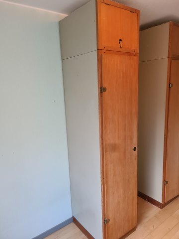 Boligens byggeskab fra 1960'erne med låge i Oregon pine designet af Børge Mogensen og Grethe Meyer. Fremstår i pæn brugt stand og låsen virker. Kan evt. stå sammen med nr. 60676