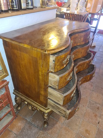 Rokoko dragkiste udført i delvis fineret mahogni og nøddetræ.